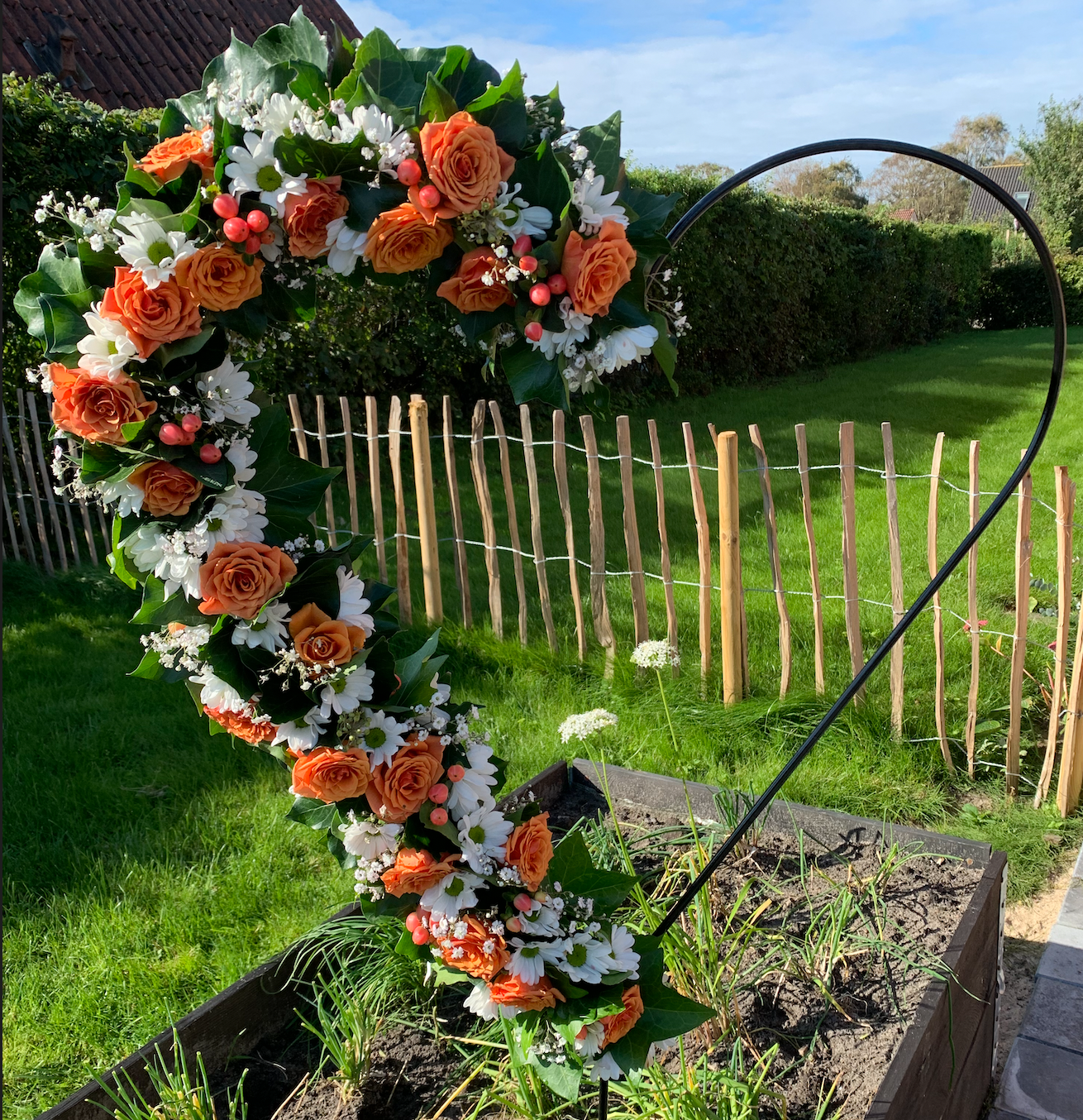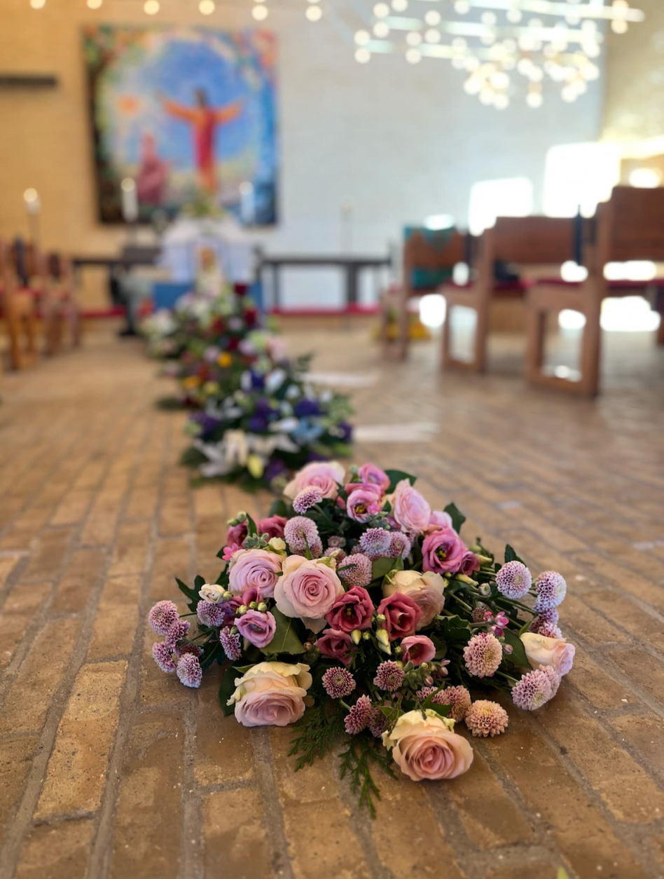 Hjerter med blomster, som fås i forskellige størrelser fra 650 kr., er et smukt og klassisk valg til at udtrykke kærlighed og respekt ved bisættelsen. Vi bruger altid årstidens blomster, som kan tilpasses efter ønsker og behov.